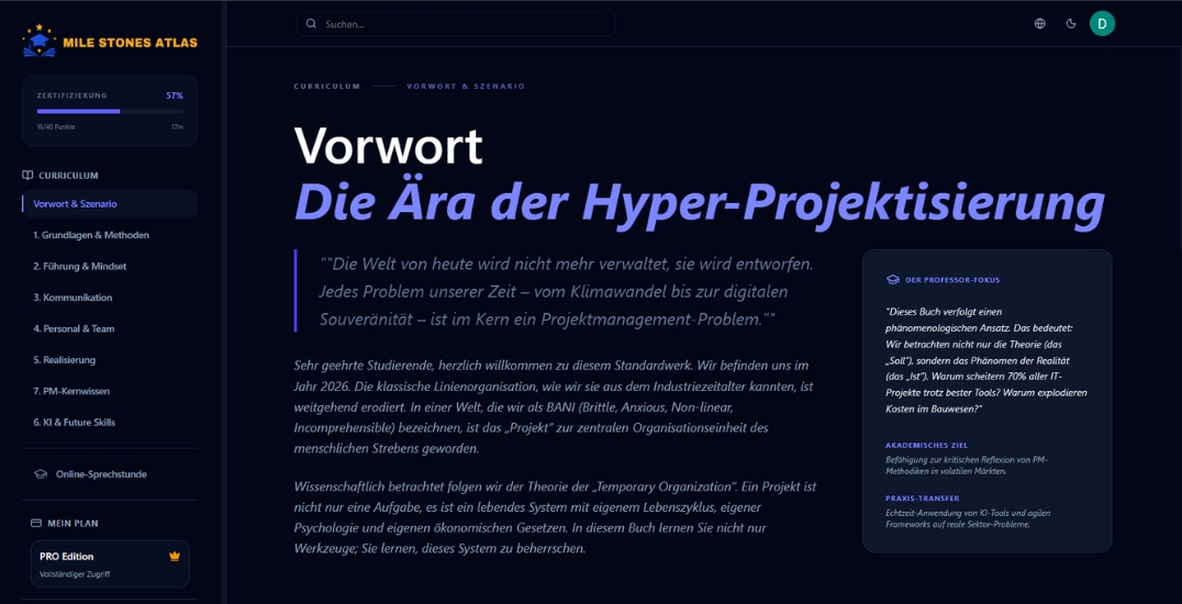 Transformieren Sie Ihre Karriere mit MilestonesAtlas. Arbeiten Sie sich durch 7 umfassende Module zu Methodik, Führung, Kommunikation und Zukunftsfertigkeiten. Jedes Modul baut auf dem vorherigen auf für strukturiertes Lernen.